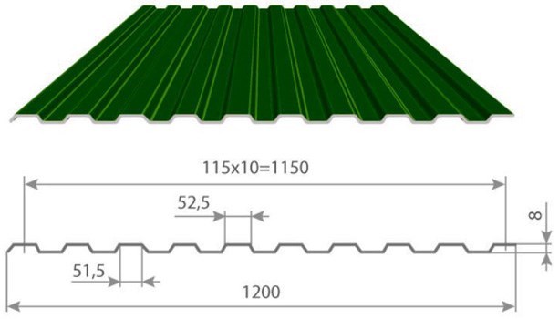 Профнастил/профиль листовой, стальной, С-8, 1.2x1.7м, толщина 0.35мм, окрашенный Зеленый RAL 6005