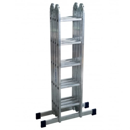 Лестница состоит из четырех секций, соединенных между собой стальными лестничными шарнирами с углами фиксации 35, 105 и 180 градусов. Поэтому такая лестница может принимать различные формы. Различные положения алюминиевой четырехсекционной шарнирной лестницы обеспечивают самоблокирующиеся соединения. Антискользящие насадки на опорах и широкая траверса обеспечивают устойчивое положение лестницы во время работы. Ступени имеют прочные крепления с направляющими надежным развальцованным соединением.