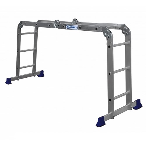 Лестница состоит из четырех секций, соединенных между собой стальными лестничными шарнирами с углами фиксации 35, 105 и 180 градусов. Поэтому такая лестница может принимать различные формы. Различные положения алюминиевой четырехсекционной шарнирной лестницы обеспечивают самоблокирующиеся соединения. Антискользящие насадки на опорах и широкая траверса обеспечивают устойчивое положение лестницы во время работы. Ступени имеют прочные крепления с направляющими надежным развальцованным соединением.