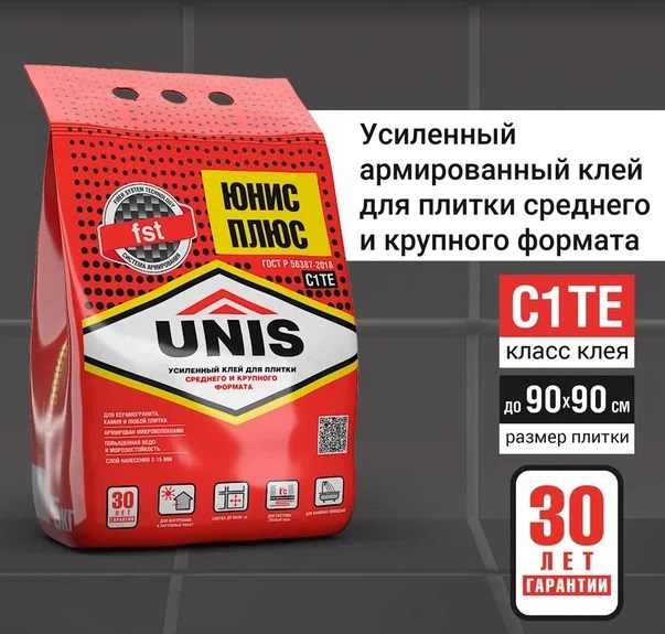 Усиленный клеевой состав для укладки любых видов керамической плитки, клинкерной плитки, плит из природного и искусственного камня, керамогранита среднего и крупного формата (до 90х90 см) на стены и полы в любых помещениях: влажных, сухих, промерзающих и отапливаемых. Клей также подходит для наружных работ, облицовки фасадов и цоколей зданий. «ЮНИС ПЛЮС» рекомендуется для сложных задач: для системы «Тёплый пол», для крепления керамогранита на фасад, укладки поверх старой плитки («плитка на плитку»).