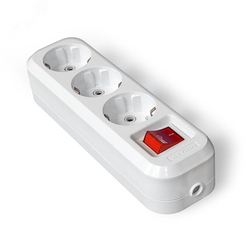 Колодка для удлинителя UNIVersal E303, трехместная, 16А, 220В, IP20, с заземлением, с выключателем, АВС-пластик, белая