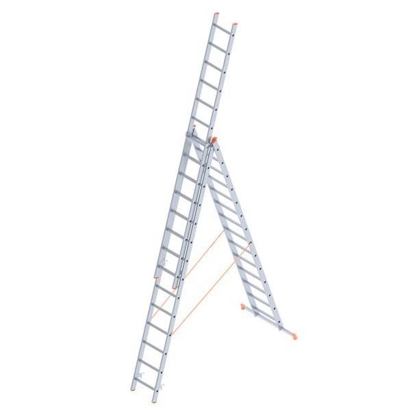 Модель включает три секции по 15 ступеней и позволяет выполнять задачи, требующие увеличенной рабочей высоты. Рабочая высота варьируется в зависимости от конфигурации. В положении «стремянка» высота достигает 4.22 м, а при частичном выдвижении секции 7.79 м. В полностью разложенном виде лестница позволяет работать на уровне до 11.36 м. Это особенно удобно для фасадных работ, обслуживания оборудования, монтажа освещения и других задач, где важна мобильность конструкции. Ширина секций от 355 до 465 мм обеспечивает удобный подъем и снижает риск неустойчивости. Противоскользящие наконечники опор обеспечивают надёжное сцепление с различными поверхностями — как гладкими, так и неровными.