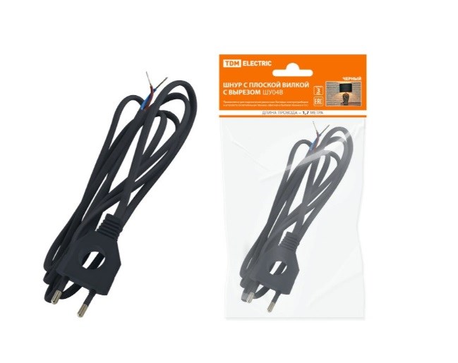 Шнур сетевой TDM ШУ04 SQ1305-0032, ШВВП 2х0.75мм2, 6А, 250В, IP20, 1.7м, с выключателем и плоской вилкой с вырезом, черный