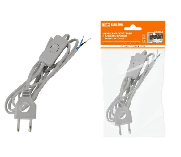 Шнур сетевой TDM ШУ03В SQ1305-0025, ШВВП 2х0.75мм2, 6А, 250В, IP20, 2м, с выключателем и плоской вилкой с вырезом, серебристый металлик