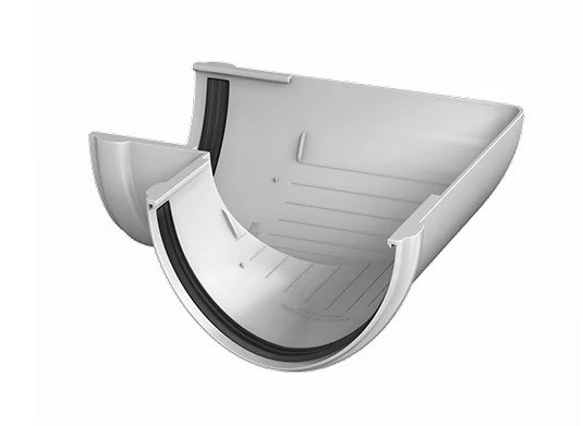 Угол желоба предназначен для соединения желобов на карнизах, которые лежат в одной плоскости, но расположены перпендикулярно относительно друг друга.