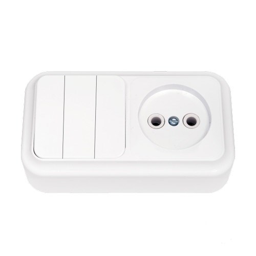 Блок - выключатель трехклавишный + розетка открытой установки без заземления