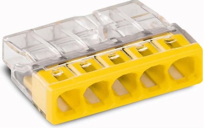 Соединительная клемма для быстрого монтажа WAGO 2273-205 служит для подключения 5 проводов одновременно в распределительной коробке.