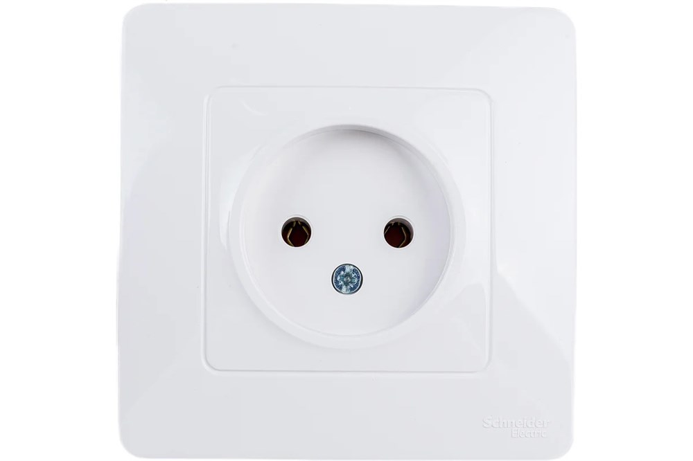 Розетка без заземления без шторок позволит подключить один электроприбор. Белый цвет изделия идеально подходит к стенам светлых оттенков, расширяющих пространство помещения.