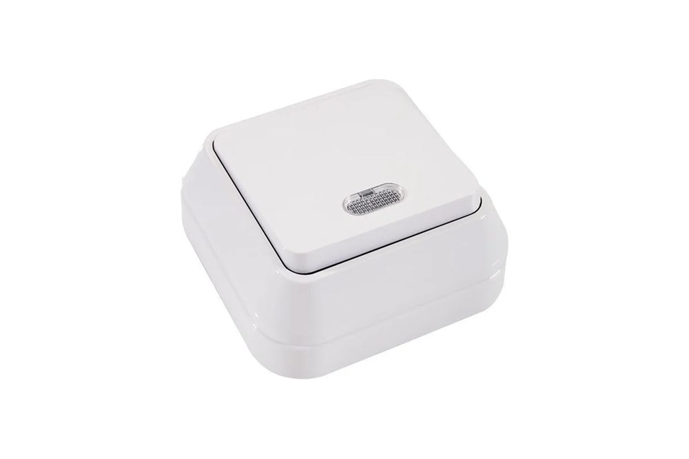 Выключатель предназначен для наружной установки. В изделии предусмотрена миниатюрная подсветка. Одноклавишный выключатель можно устанавливать в помещениях, которые подвержены повышенной влажности, так как устройство обладает повышенной степенью защиты от пыли и влаги (IP 20). Для производства использовался высококачественный пластик белого цвета.