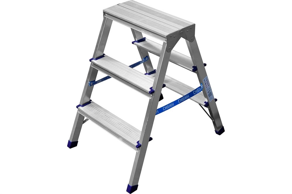 Двухсторонняя алюминиевая стремянка подходит для применения в быту. Широкие рифленые ступени обеспечивают более безопасный подъём и спуск. Опорные ножки имеют пластиковые накладки, которые препятствуют скольжению стремянки.