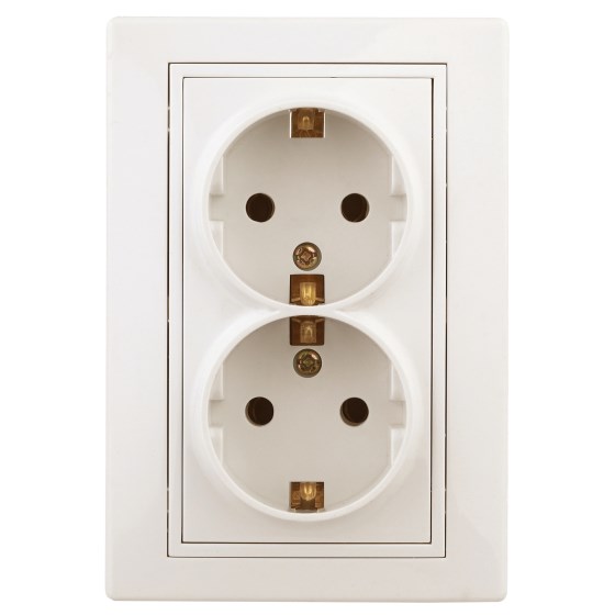 Розетка выполнена из керамики, укомплектована одноместной рамкой, оснащена винтовыми клеммами. Клеммы с двумя отверстиями позволяют соединять соседние розетки шлейфом. Установка в подрозетник производится как на монтажные лапки, так и на винты.