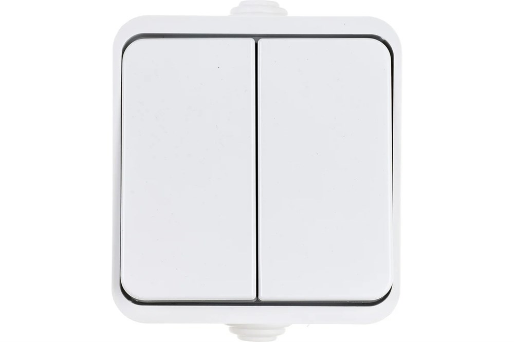 Двухклавишный выключатель подходит для открытой установки в сеть 230В. Токовая нагрузка 10А. Специальные манжеты в корпусе обеспечивают повышенную герметичность изделия. Уровень защиты от пыли и влаги соответствует IP44. Материал корпуса – износостойкий ABC-пластик, основание – негорючий PC-пластик. Монтажная пластина в комплекте. Две клавиши обеспечат удобство контроля и управления за освещением из одной точки.