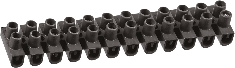 Клемная колодка состоит из 12 парных зажимов и легко режется на блоки с меньшим числом клеммных пар. Подключение электрических проводников осуществляется при помощи прижатия проводов винтами из оцинкованной стали.