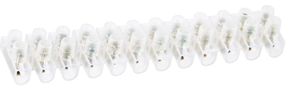 Клемная колодка состоит из 12 парных зажимов и легко режется на блоки с меньшим числом клеммных пар. Подключение электрических проводников осуществляется при помощи прижатия проводов винтами из оцинкованной стали.