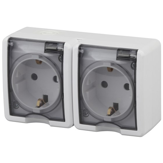 Розетка двойная открытой установки. Устройство выполнено из качественного поликарбоната, оснащёно уникальными винтовыми клеммами ЭКСПЕРТ для максимально качественного зажима кабеля в механизме.