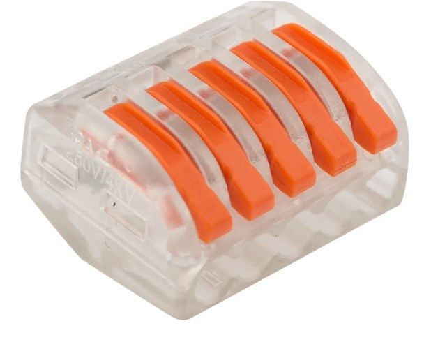 Соединительная многоразовая клемма REXANT на 5 проводников с плоско-пружинным зажимом предназначена для подсоединения медных одножильных и многожильных зачищенных проводников тонкого сечения.