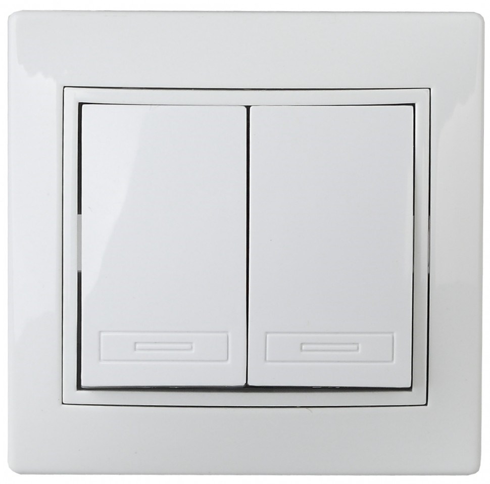 Двухклавишный выключатель - коммутационное устройство для включения и выключения люстр и светильников в помещениях различного назначения. Выключатель выполнен из качественного термопласта, стали и латуни, оснащён винтовыми зажимами.