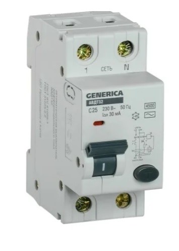 Дифференциальный автомат GENERICA АВДТ32, двухполюсный 2Р, 25А, 4.5kA, 30мА, тип С
