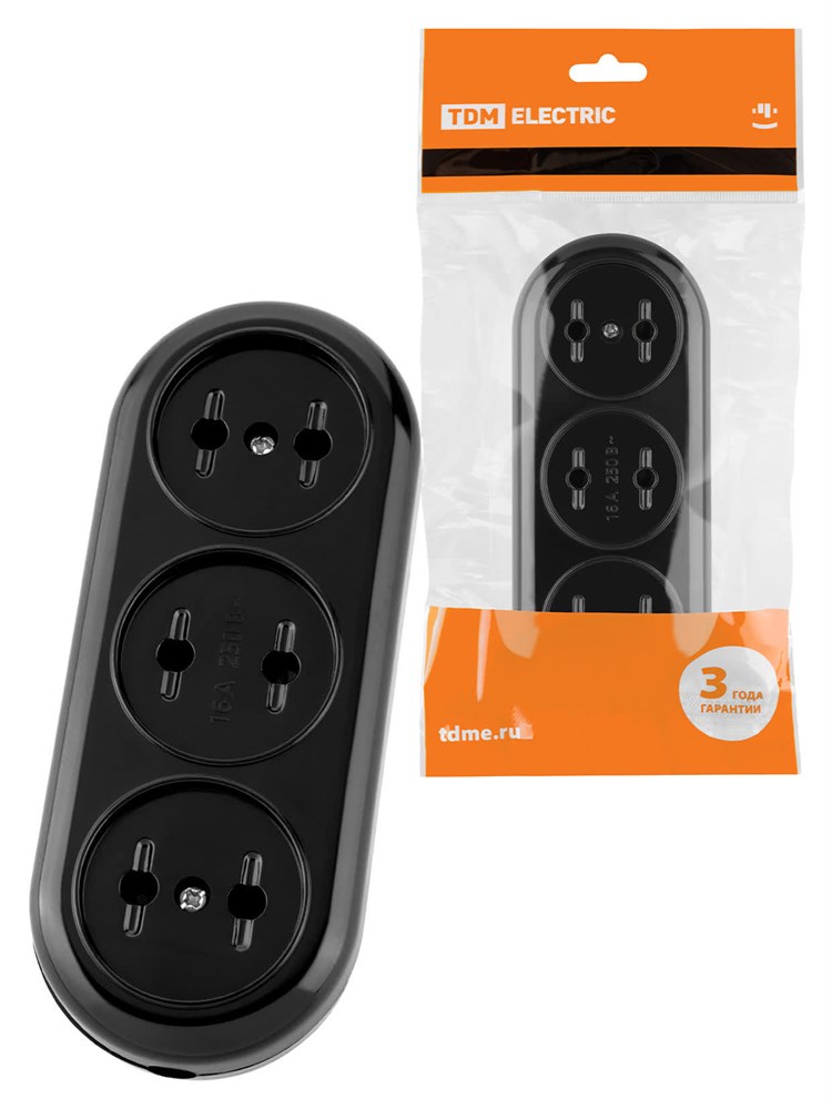 Колодка для удлинителя TDM Ретро SQ1806-0104, трехместная, 16А, 250В, без заземления, карболит, черная