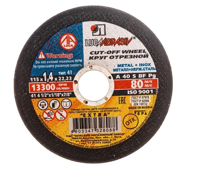 Круг отрезной Луга предназначен для ручных резчиков. Применяется для высокопроизводительной резки деталей и конструкций из различных марок стали и быстрорежущей стали. Круг особенно эффективен при резке тонкостенного профиля и листового металла.