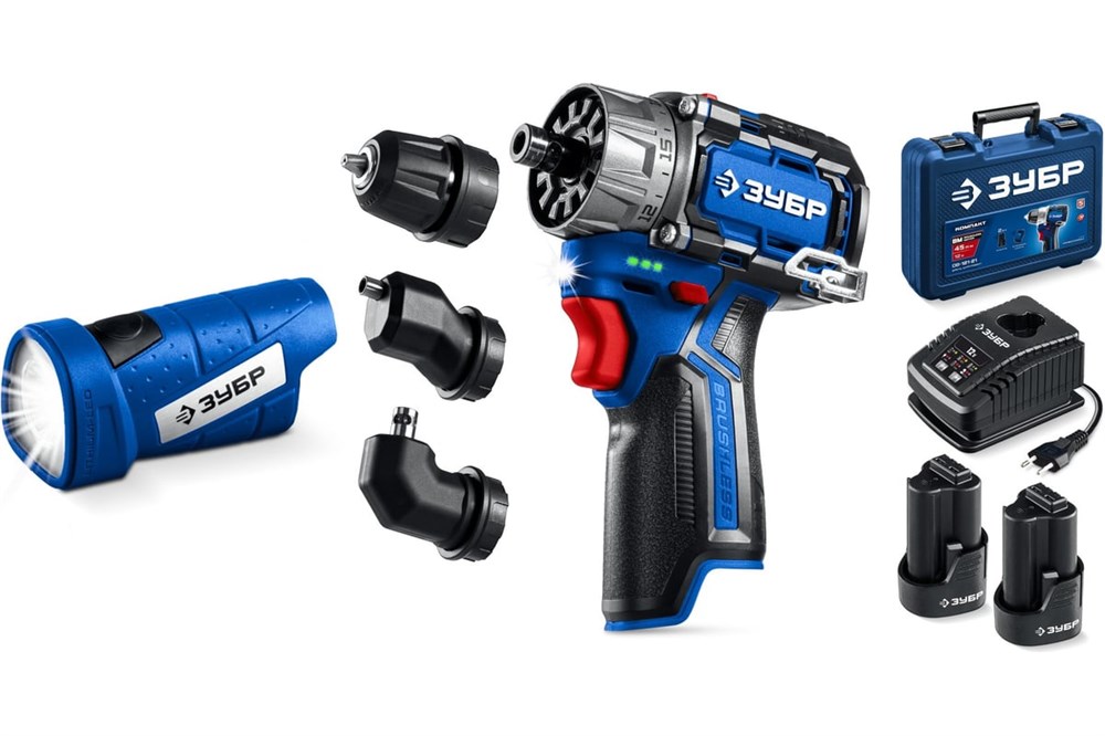 Дрель-шуруповерт аккумуляторная ЗУБР Профессионал DB-125-22F Комби №4, модульная, 12В, 2 АКБ, 45Нм, 2 Ач, LED фонарь, в кейсе