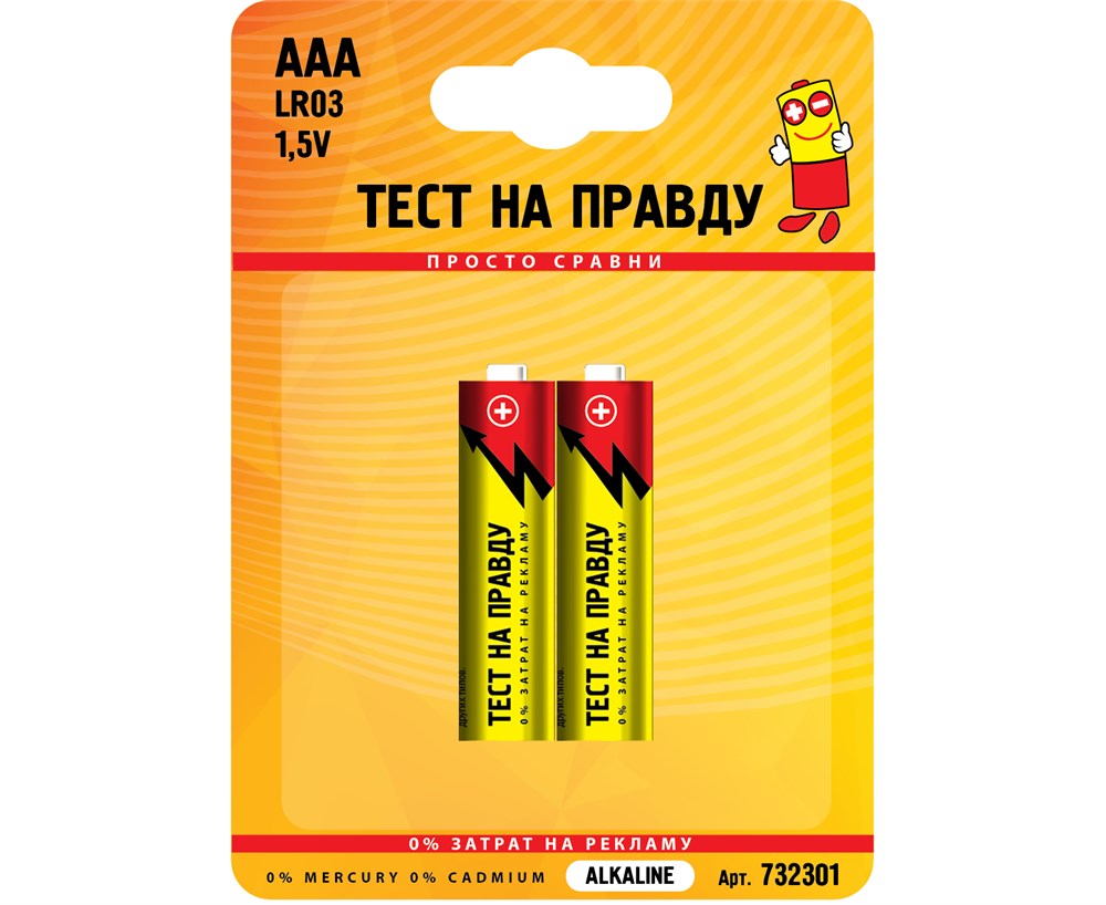 Элемент питания (батарейка) ТЕСТ НА ПРАВДУ LR03/286 BL2, мизинчиковый, щелочной, 1.5В, 2шт. в блистере