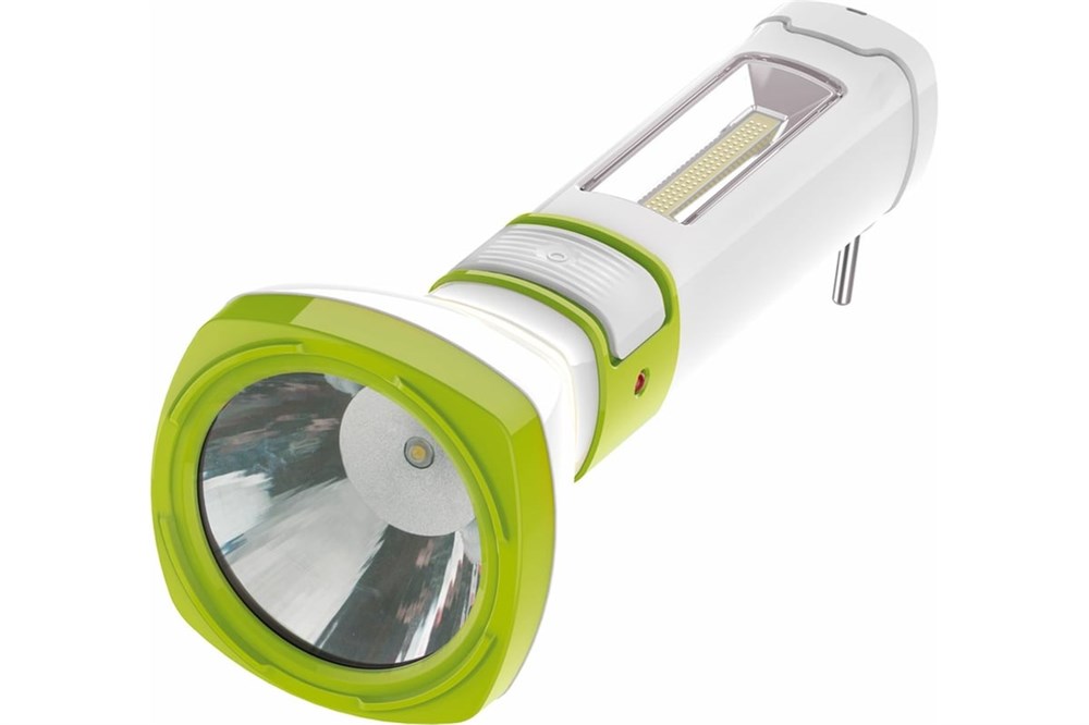 Два разных источника света, 2 в 1 объединены в корпусе ручного фонаря. Полноценный аккумуляторный фонарь и боковой светильник на современных светодиодах СОВ. Мощность фонаря 5W, светильника 2W COB. Выдвижная вилка с адаптером. Луч прожектора для освещения вдаль, а светильник для широкой подсветки рабочей зоны.