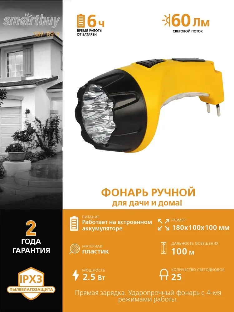 Фонарь ручной SMARTBUY SBF-89-Y, аккумуляторный, встроенная вилка 220В, 15+10 светодиодов, 4 режима