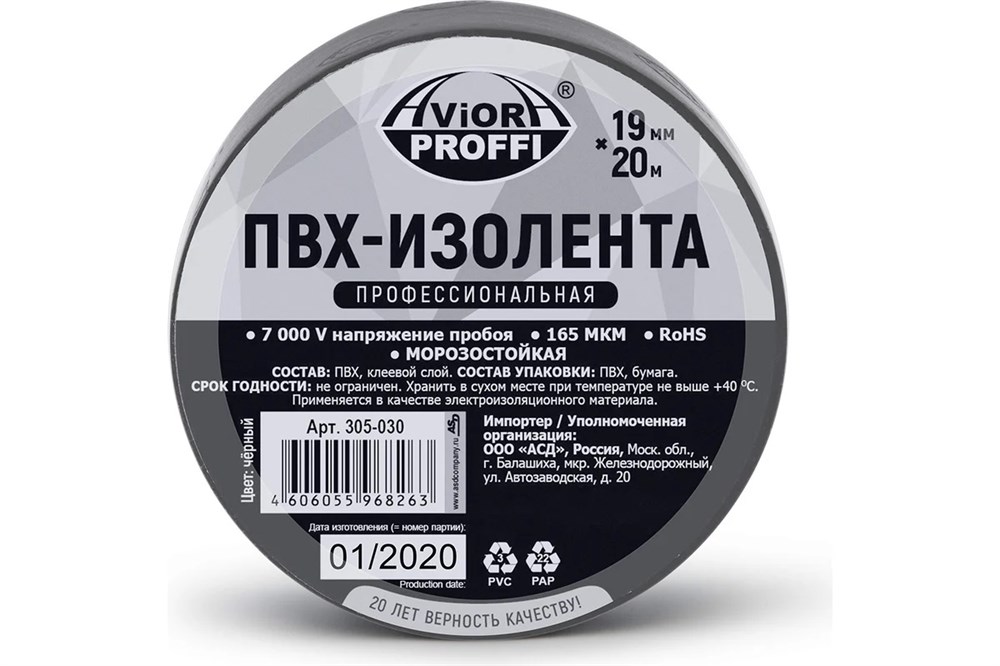 Изолента AVIORA 305-030, 19ммх20м, ПВХ, черная, профессиональная