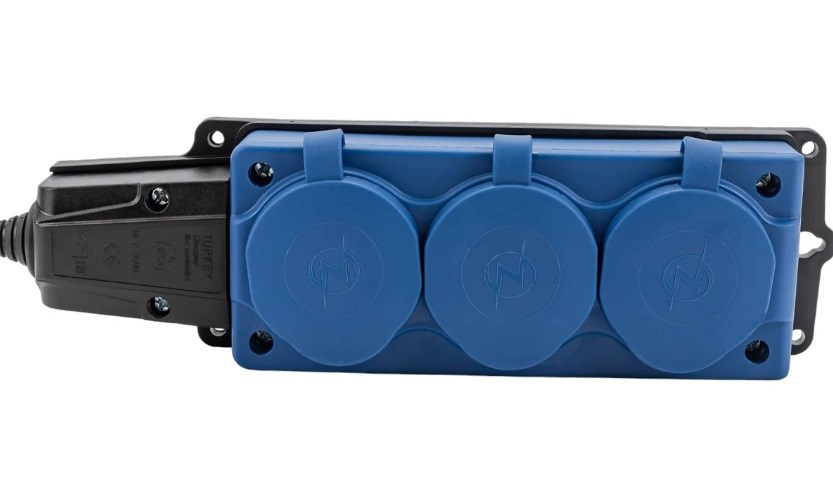 Колодка для удлинителя NE-AD 4143, трехместная, 16A, 220-240В, IP54, 3500Вт, с заземлением, с заглушкой, каучук, синий