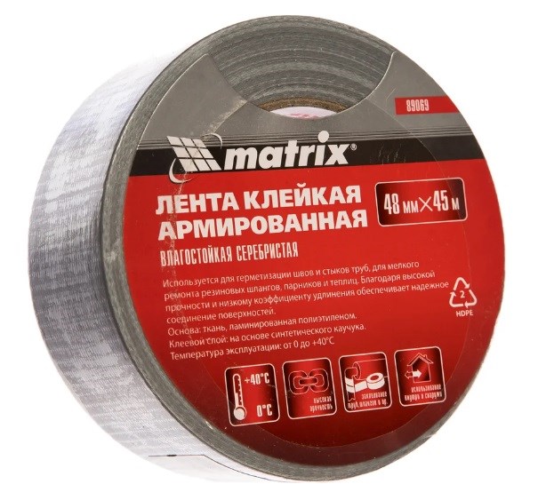 Влагостойкая клейкая армированная лента Matrix, серебристого цвета, позволяет решить множество задач в быту и на производстве. С ее помощью можно осуществить мелкий ремонт различных изделий, герметизировать соединения, предотвратить попадание пыли и воды на детали и т.д.