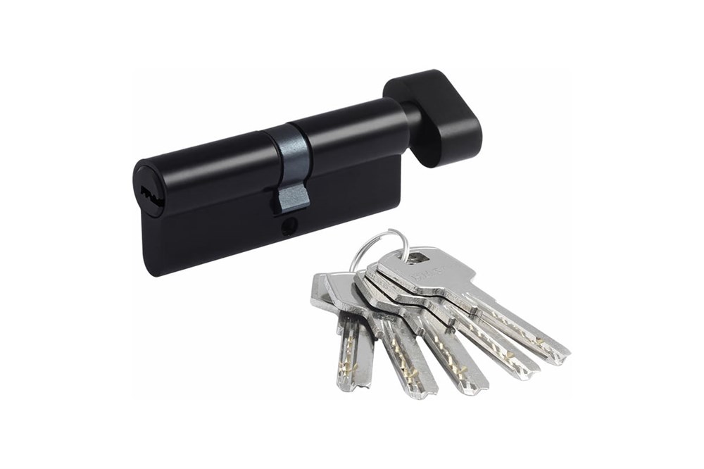 Цилиндровый механизм для межкомнатных и входных дверей. Материал ЦАМ (сплав цинка, алюминия и меди). В комплекте 5 стальных перфорированных ключей. 5 пинов. Цилиндр имеет вертушку для удобного запирания изнутри помещения без использования ключа. Длину цилиндра необходимо подбирать исходя из толщины двери, с небольшим запасом под накладку.