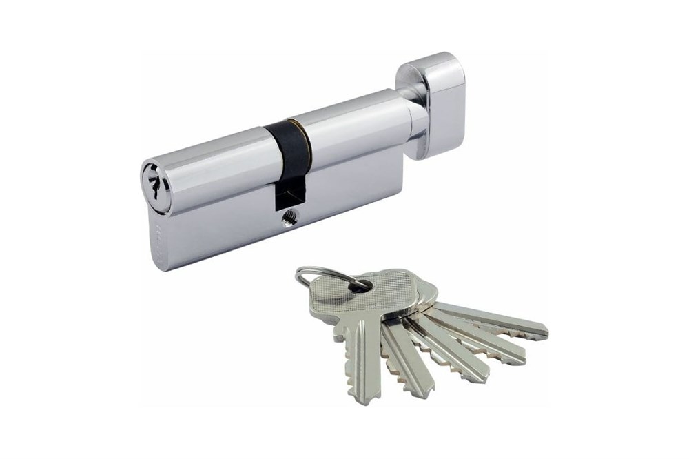 Цилиндровый механизм для межкомнатных и входных дверей. Материал ЦАМ (сплав цинка, алюминия и меди). В комплекте 5 стальных перфорированных ключей. 5 пинов. Цилиндр имеет вертушку для удобного запирания изнутри помещения без использования ключа. Длину цилиндра необходимо подбирать исходя из толщины двери, с небольшим запасом под накладку.