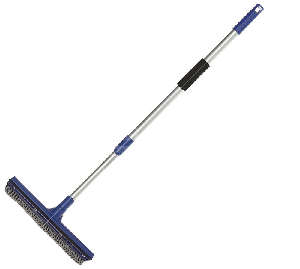 Стеклоочиститель оснащён удобной телескопической ручкой из металла. Она регулируется по высоте и в случае надобности полностью снимается. Для очистки стекла с сильными загрязнениями предусмотрен специальный скребок. Он выполнен из мягкой резины, не повреждающей поверхность. Финальная чистка осуществляется с помощью насадки из микрофибры, которая хорошо впитывает воду и не оставляет разводов. Также имеется функция сгона воды. Все насадки меняются достаточно легко и быстро.