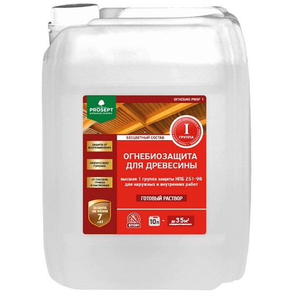 Покрытие защитное (антисептик) PROSEPT ОГНЕБИО PROF1, 10л, огнебиозащита для древесины, 1 группа, бесцветный