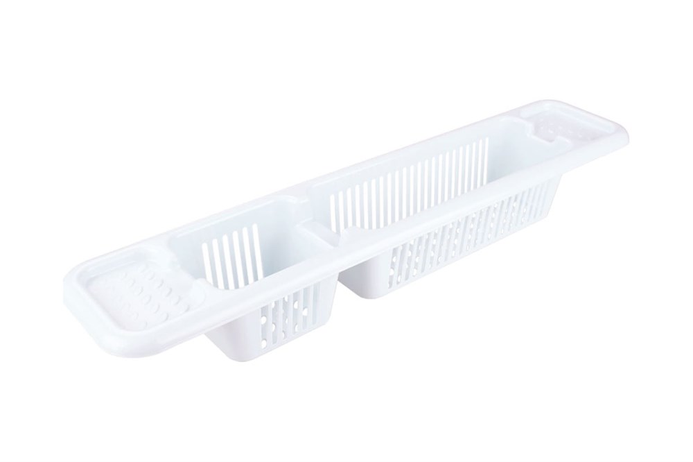 Полка для ванной станет идеальным решением для хранения ванных принадлежностей при купании в ванной. Полка устанавливается на ванну. Конструкция полки имеет два отсека с отверстиями, благодаря которым вода не будет скапливаться. Также на бортиках есть углубления для мыла с ребристой поверхностью, благодаря которой мыло не будет выскальзывать.