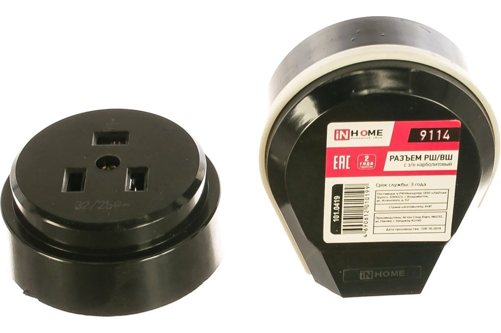 Разъем РШ-ВШ IN HOME 9123 2Р+РЕ, 250В, открытой установки, с заземлением, белый