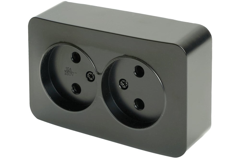 Представляет собой устройство на 2 гнезда, выполненное в черном матовом цвете. Эта модель предназначена для открытой установки и имеет степень защиты IP20, что делает ее идеальной для использования внутри помещений. Розетка не оснащена заземлением и рассчитана на работу при номинальном токе 10А.