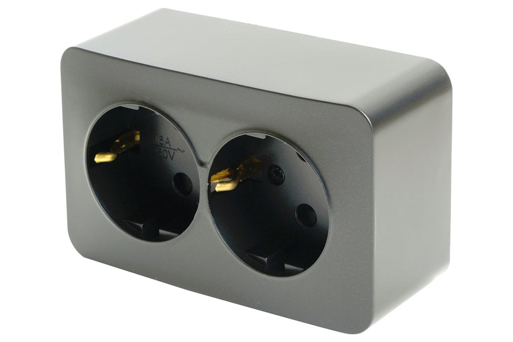 Представляет собой устройство на 2 гнезда, выполненное в черном матовом цвете. Эта модель предназначена для открытой установки и имеет степень защиты IP20, что делает ее идеальной для использования внутри помещений. Розетка оснащена заземлением и рассчитана на работу при номинальном токе 16А.