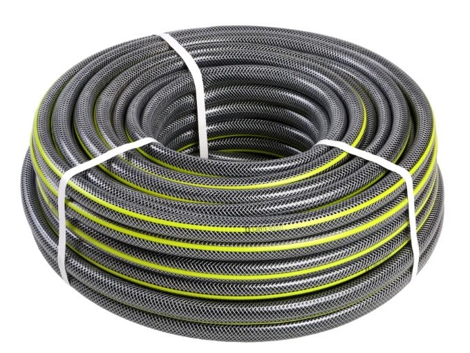 Шланг поливочный Дальняя заимка E1M, 1/2дюйма, 25м, ПВХ, трехслойный, армированный, серый с зеленой полосой