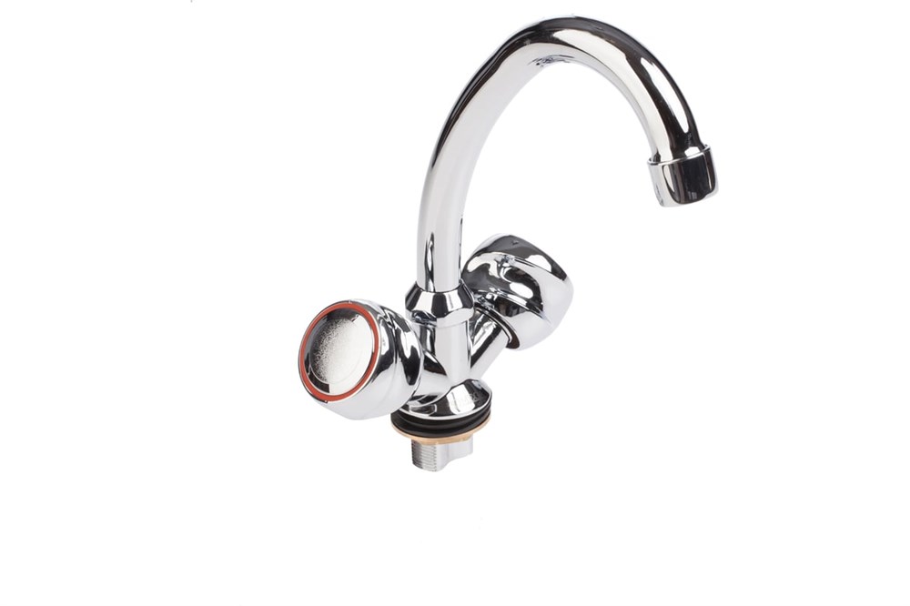 Двухвентильный смеситель для кухни изготовлен из цинкового сплава с хромированным покрытием. Он сочетает в себе современный дизайн и функциональность. Этот кухонный смеситель с поворотным изливом и аэратором обеспечивает удобство использования и экономию воды. Подводка не входит в комплект.