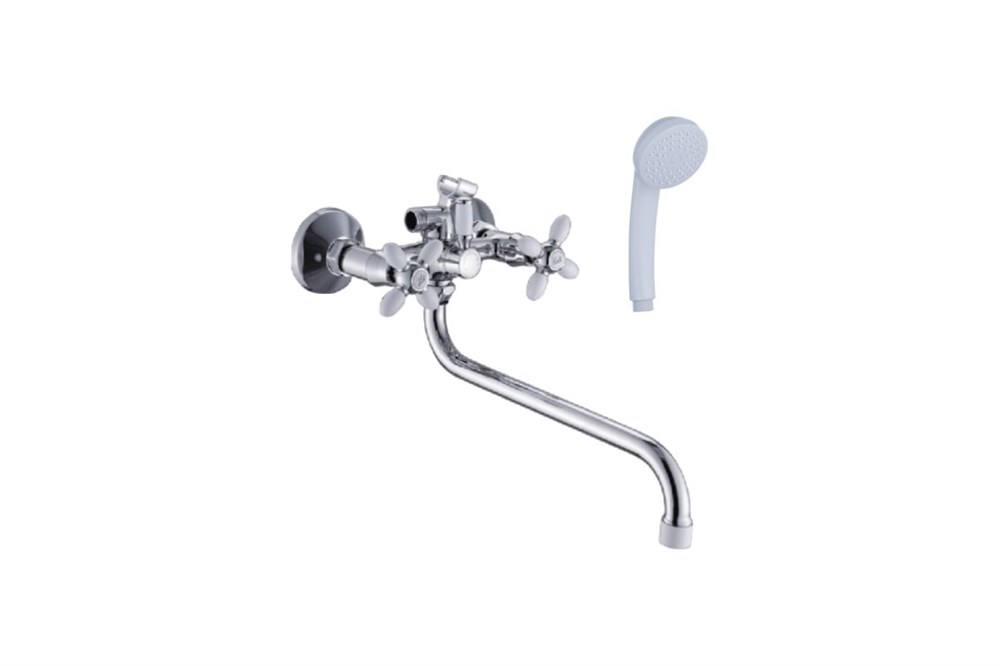 Смеситель для ванны с круглым, поворотным, длинным изливом. Переключатель "кран-душ" поворотный, шаровый расположен в корпусе смесителя для ванной и умывальника. Излив трубчатый, S-образный, снабжён экономным аэратором с пластиковой вставкой. Для регулировки горячей и холодной воды применяются кран-буксы с керамическими пластинами и увеличенным сроком службы. Вывод для подключения душевого шланга расположен в верхней части смесителя в ванную на держателе. Шланг для душа гибкий в металлической нержавеющей оплётке стандартным диаметром 1/2" длиной 150 см. Лейка душевая пластиковая, один режим струи. Элементы ручек маховиков, водосберегающая насадка и лейка для душа белого цвета.