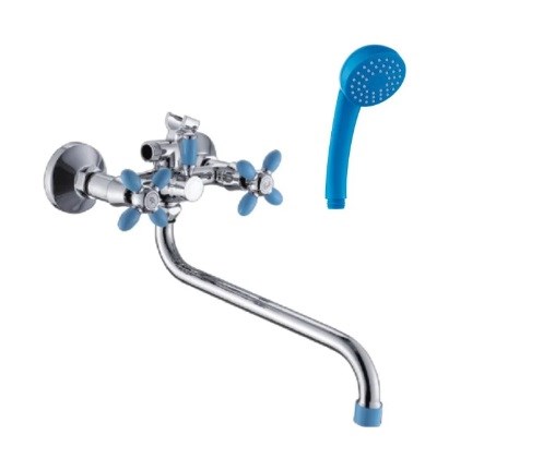 Смеситель для ванны изготовлен из высококачественного цинкового сплава. Хром-никелевое покрытие корпуса улучшает внешний вид, облегчает уход и продлевает срок службы смесителя. Переключатель "кран-душ" поворотный, расположен в корпусе смесителя. Излив поворотный, трубчатый, S-образный, снабжён аэратором с пластиковой вставкой. Пластиковая вставка не ржавеет и долго не покрывается известковым налётом. Для регулировки воды применяются кран-буксы с керамическими пластинами и увеличенным сроком службы. Вывод для подключения душевого шланга расположен в верхней части смесителя. Душевой шланг гибкий в металлической хромированной оплётке 1/2"х1/2" длиной 150 см. Лейка пластиковая, один режим струи. Элементы ручек, аэратор и лейка синего цвета. Держатель лейки на корпусе смесителя.