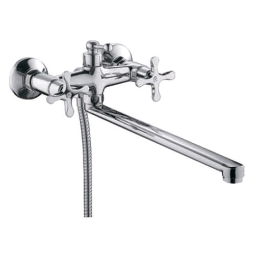 Смеситель имеет два рычага для того, чтобы регулировать напор горячей и холодной воды. Наличие аэратора в данном приборе помогает обеспечить равномерный поток воды и ее относительноесмягчение. Монтируется в стену с целью подключения подводки из стены. Модель обладает поворотным изливом.Монтаж прибора выполняется на два отверстия, которые имеются в раковине или умывальнике. В комплекте инструкция по установке, гарантийный талон, душевая лейка , держатель лейки , комплект эксцентриков , комплект отражателей.