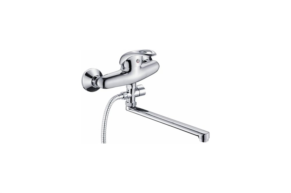 Смеситель для ванны с длинным поворотным изливом . Картридж 35 мм с керамическими пластинами. Шаровый переключатель латунный на душ поворотный на корпусе крана. Душевой гибкий усиленный шланг в металлической оплётке 1/2" длиной 150 см. Душевая лейка белая пластмассовая с 1 режимом струи. Держатель лейки настенный на 1 положение.