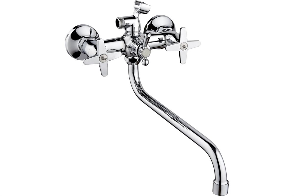 Смеситель двухвентильный для ванной комнаты с длинным поворотным изливом. Прямой плоский гусак длиной 40 см снабжен съемным аэратором. Монтируется в два отверстия для подключения холодной и горячей воды, латунные эксцентрики переходники 3/4х1/2 с декоративными хромированными отражателями входят в комплектацию. В комплекте металлический гибкий шланг для душа 1,5 м (150см), лейка для душа 1-режимная из ударопрочного ABS-пластика и держатель для лейки на корпусе крана.