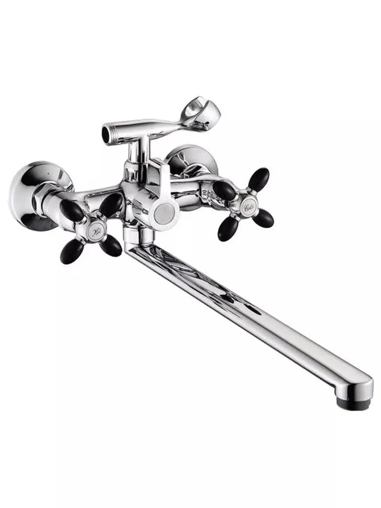 Смеситель двухвентильный для ванной комнаты с длинным поворотным изливом. Прямой плоский гусак длиной 32 см снабжен съемным аэратором. Монтируется в два отверстия для подключения холодной и горячей воды, латунные эксцентрики переходники 3/4х1/2 с декоративными хромированными отражателями входят в комплектацию. В комплекте металлический гибкий шланг для душа 1,5 м (150см), лейка для душа 1-режимная из ударопрочного ABS-пластика и держатель для лейки на корпусе крана.