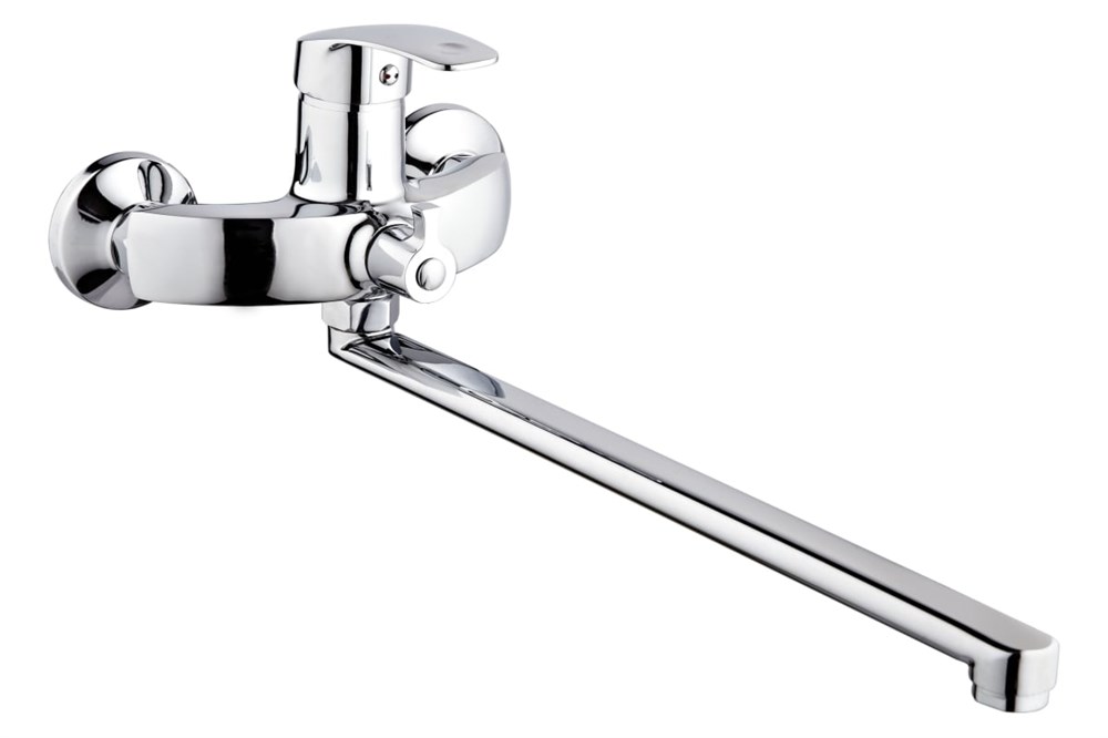 Однорычажный настенный смеситель для ванны с длинным поворотным изливом надежен и эффективен в использовании. В комплекте удобная лейка с гибким шлангом, настенный держатель, эксцентрики и отражатели.