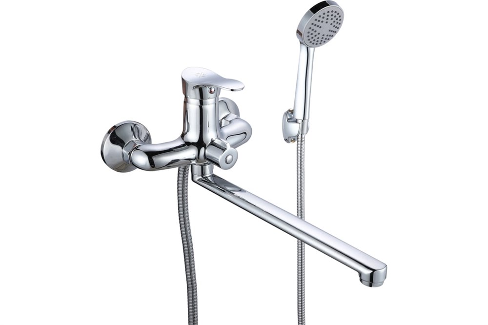 Однорычажный настенный смеситель для ванны с длинным поворотным изливом надежен и эффективен в использовании. В комплекте удобная лейка с гибким шлангом, настенный держатель, эксцентрики и отражатели.