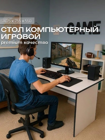 Стол компьютерный игровой 1075x550x755мм, белый, черная кромка